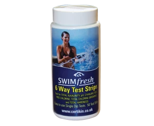 Bottle of 50 test strips for chlorine, bromine, pH and alkalinity.