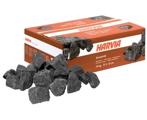 The reason for this is that the split-face stones store plenty of heat, making the water thrown onto them vaporise efficiently on the broad fracture surface. The split-face stones are easy to stack and enable good air circulation, which saves the heating elements of an electric heater. Light (ceramic), soft (soapstone) and smooth (rounded) sauna stones do not produce the desired results. The split-face sauna stones by Harvia are selected with respect for old sauna traditions and provide bathers with proper, soft steam sensations.
